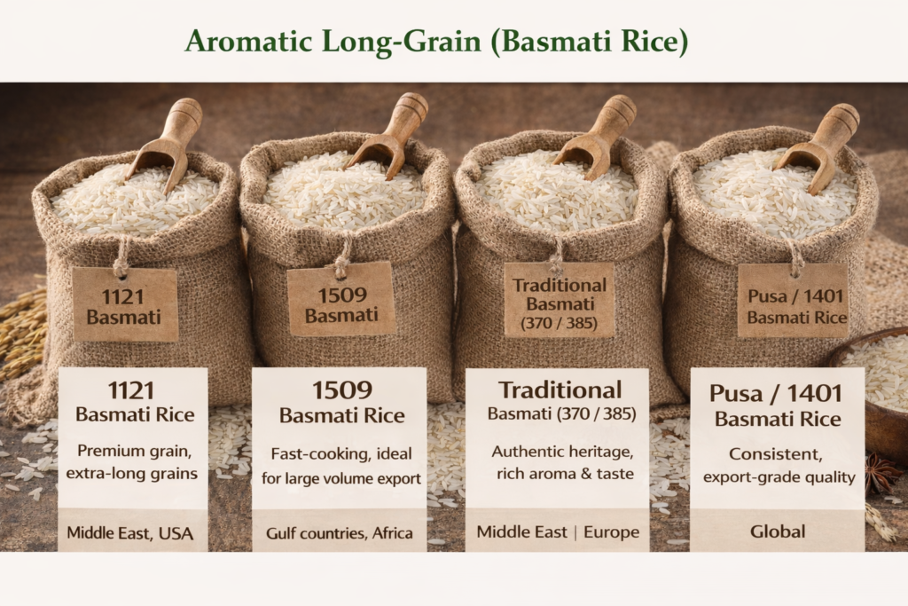 Extra-long grain basmati rice known for its superior aroma and excellent elongation after cooking. Widely preferred for premium export markets.