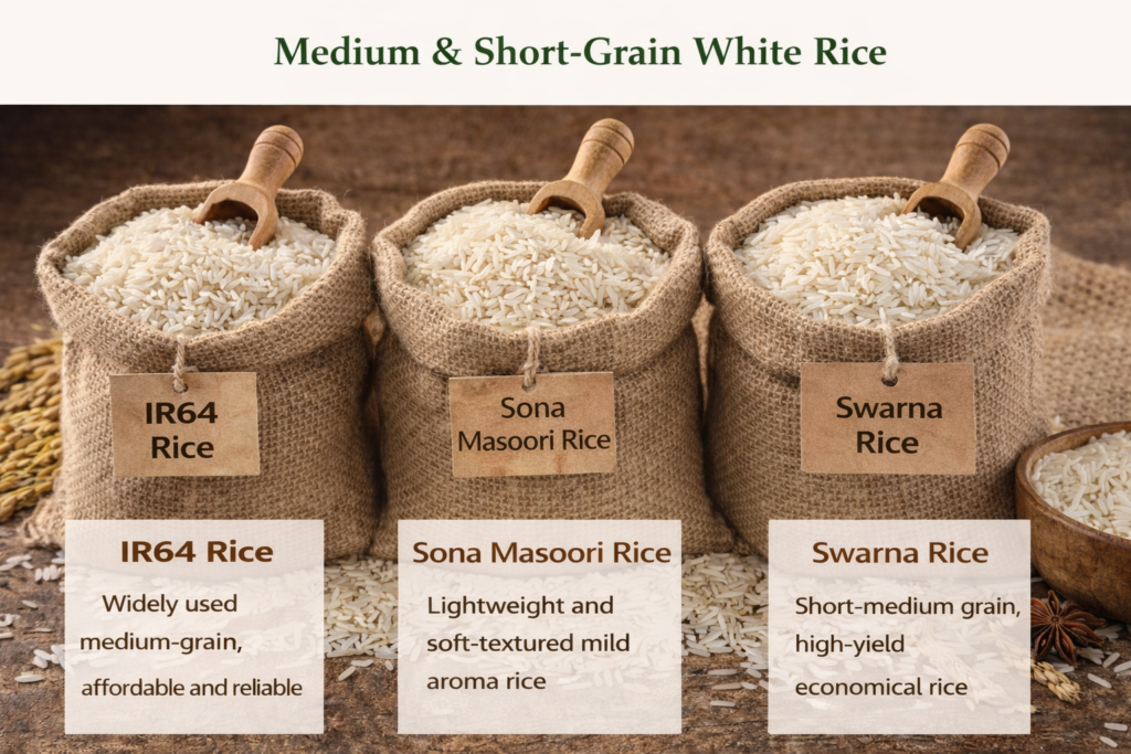 A widely accepted medium-grain rice offering affordability and reliable quality for staple consumption.